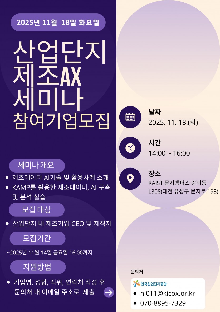 제조AI 분석실습을 통한 제조기업의 AX 기반 기업 경쟁력 강화를 도모하기 위해 산업단지 제조AX 세미나를 아래와 같이 개최하오니,
